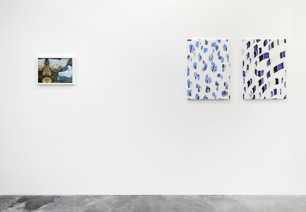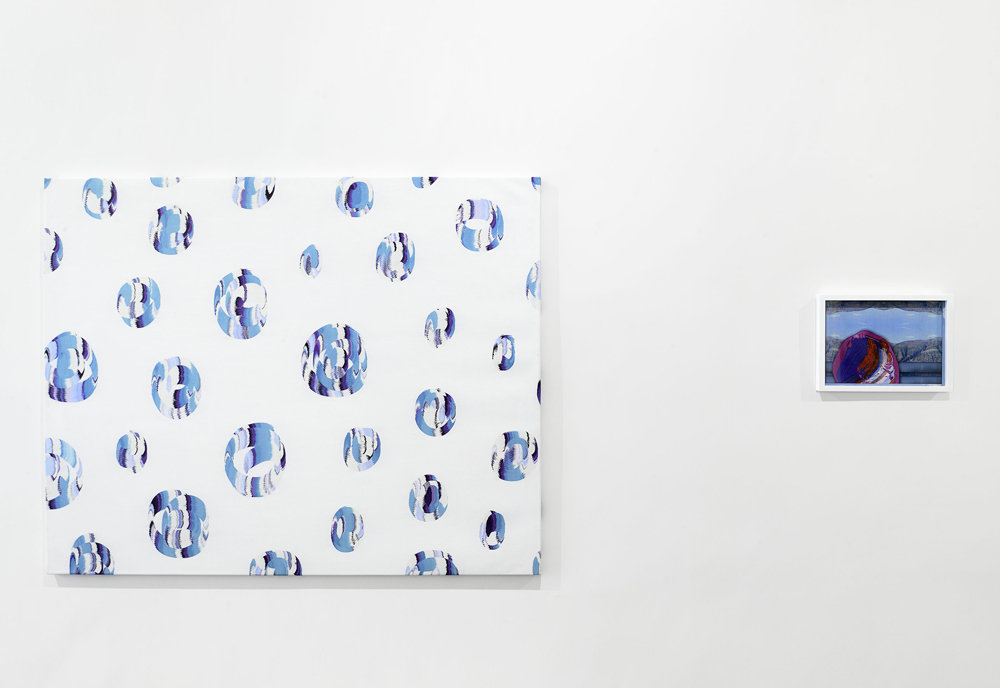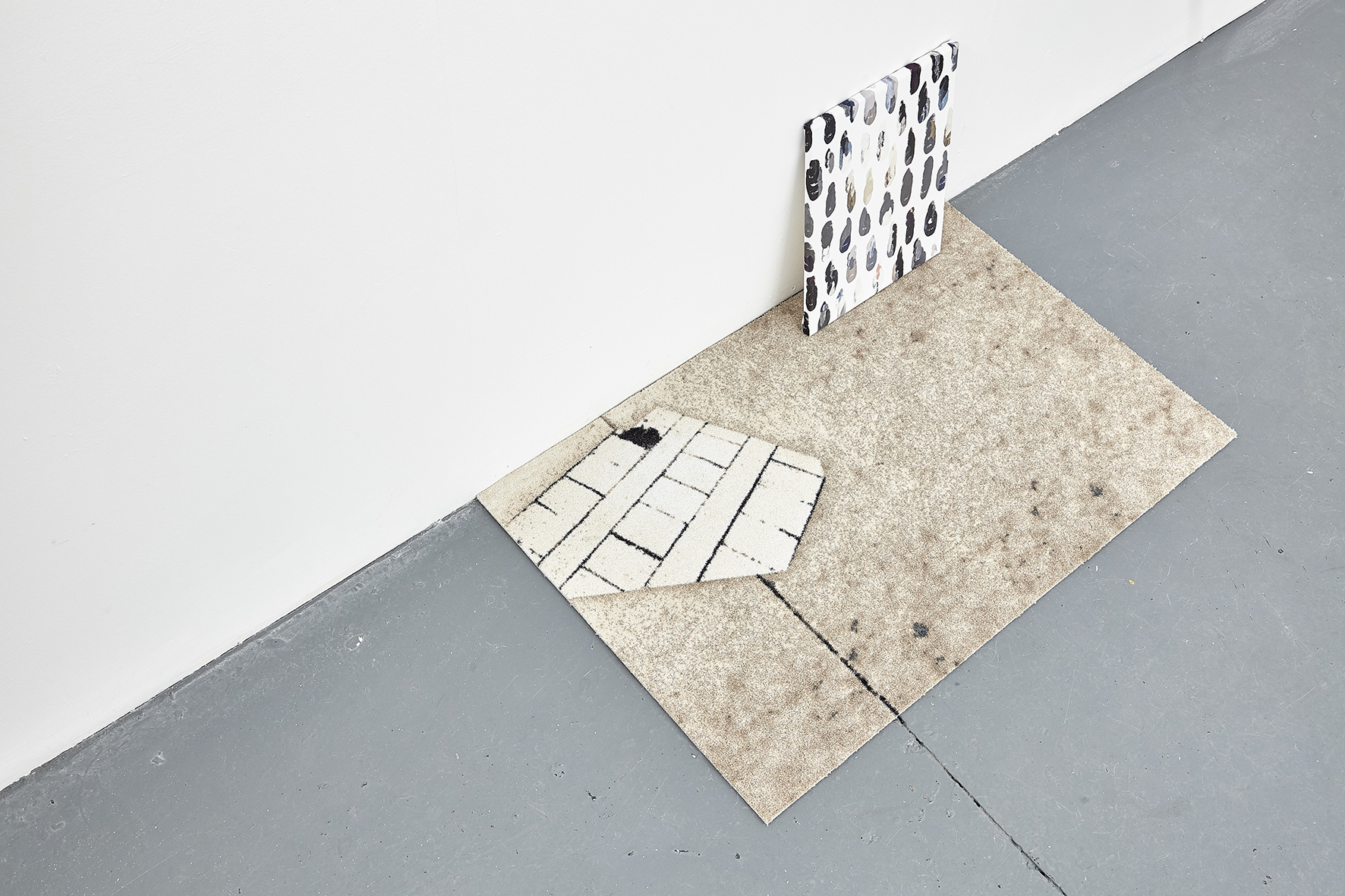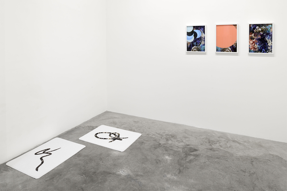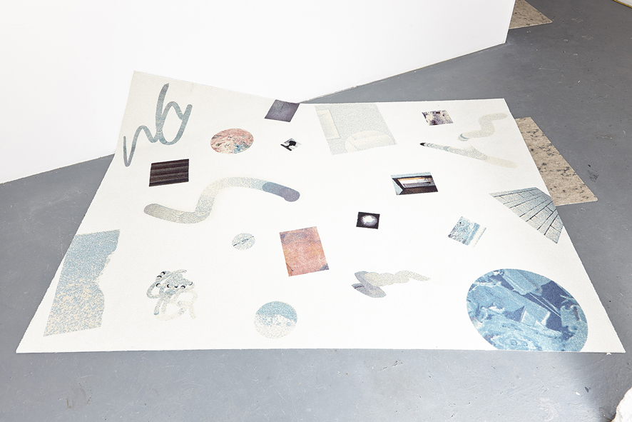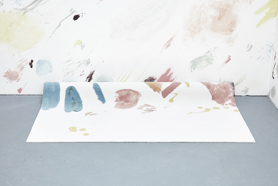 Untitled Rug #8, digitally printed rug, and Terry, Wet Paint performance piece, digital print on canvas, 2016