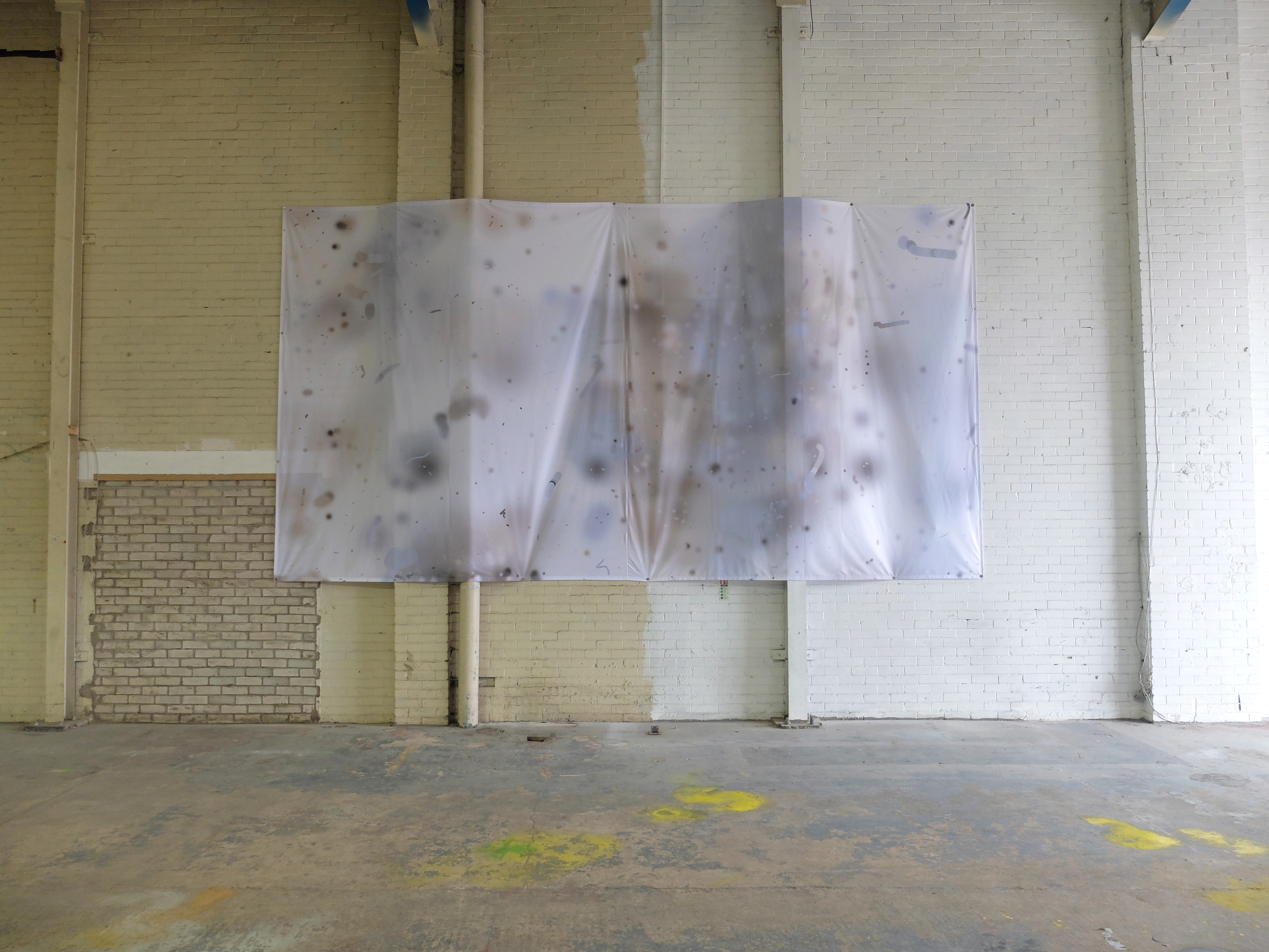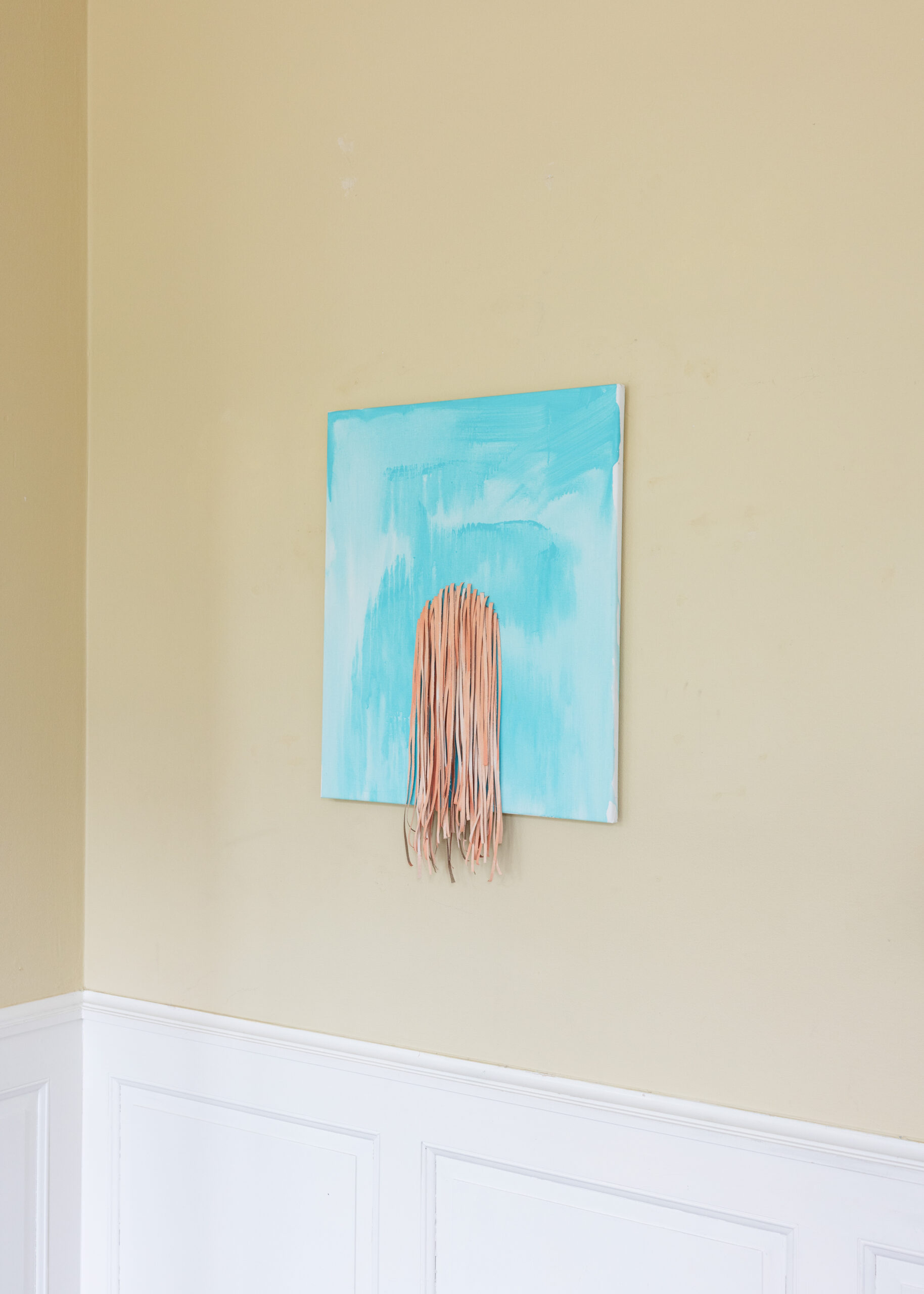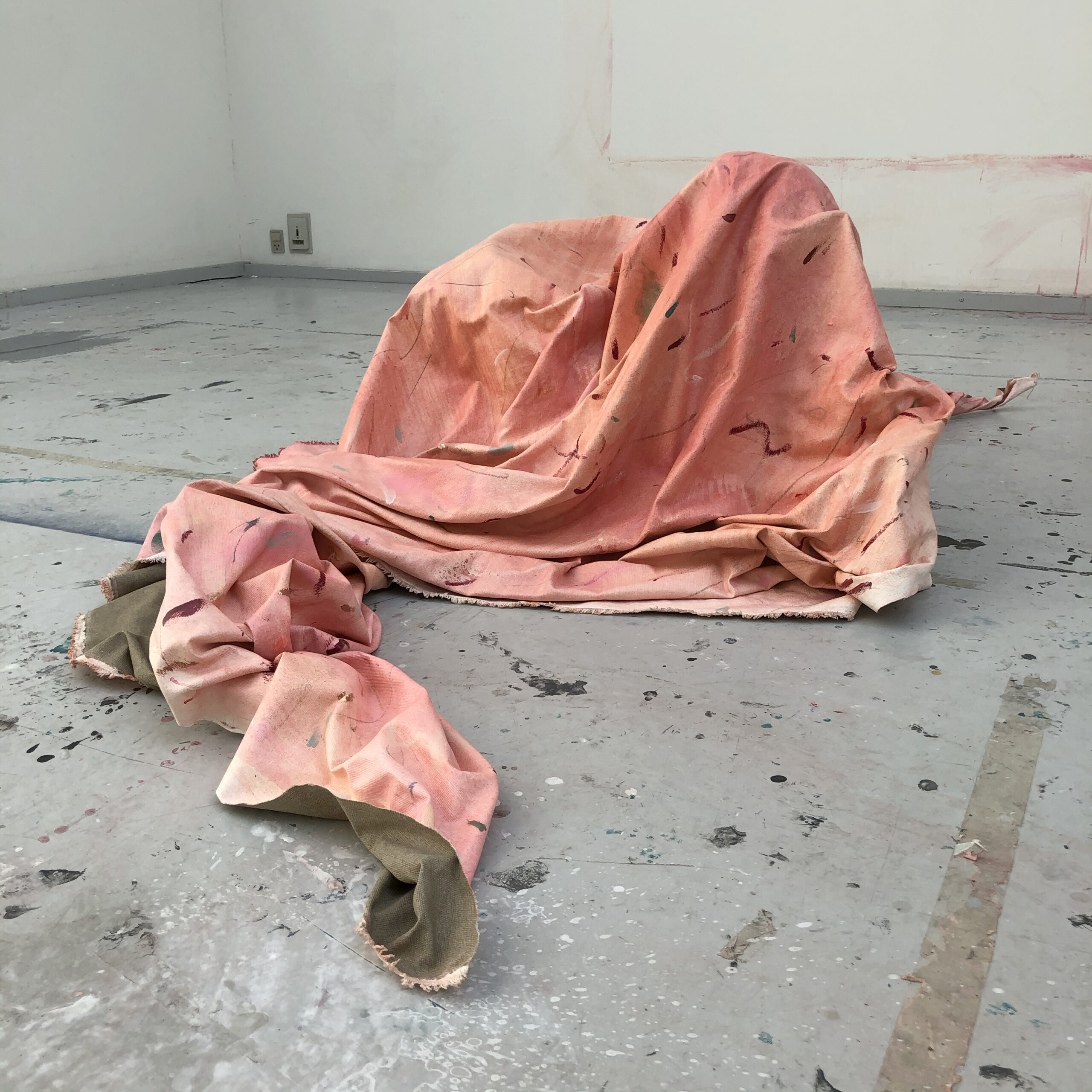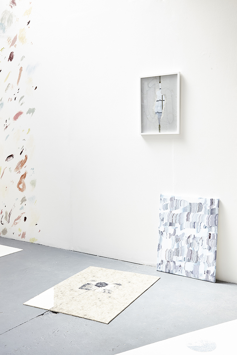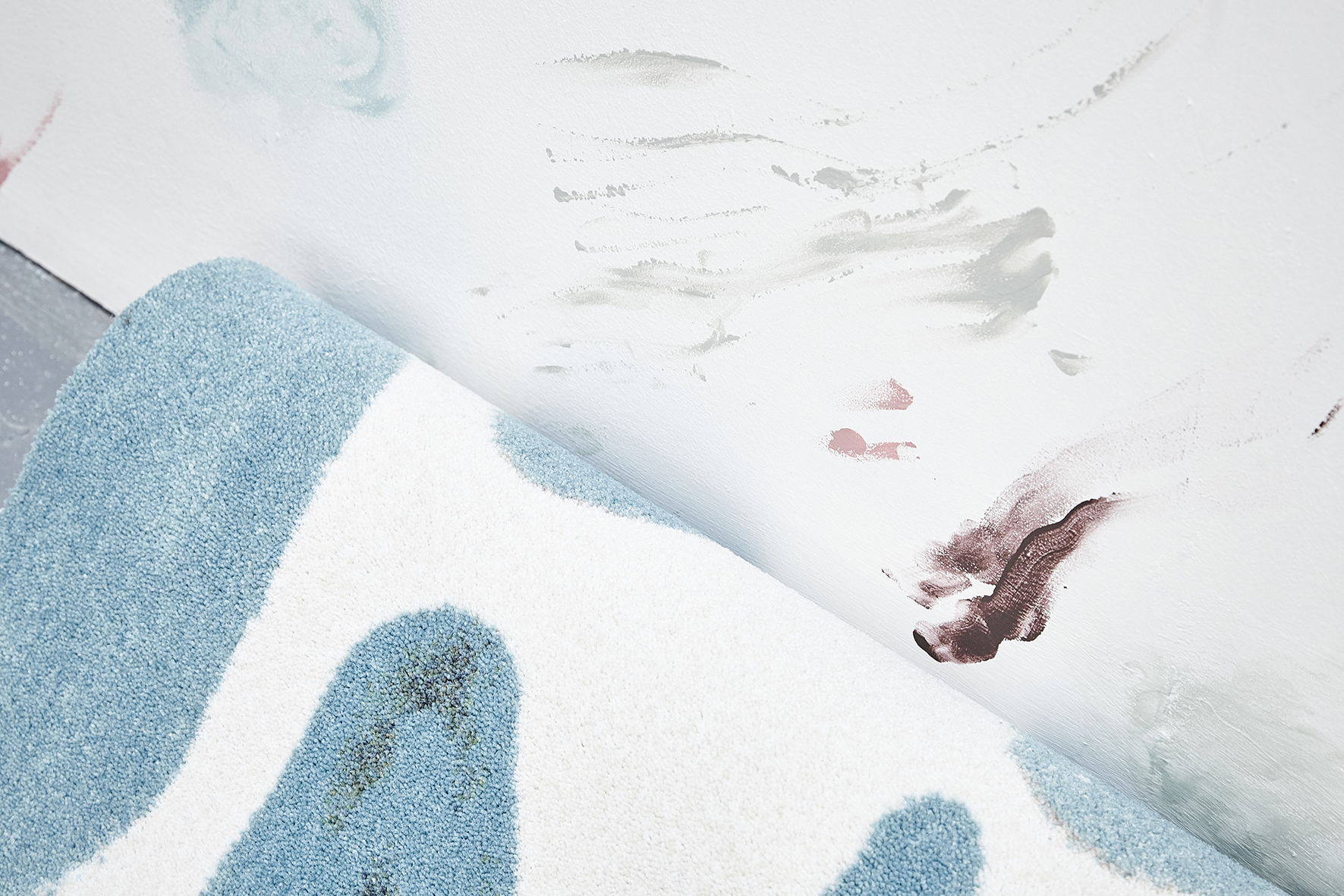 Finger painted wall, detail, and Untitled, Folded Rug, 2016